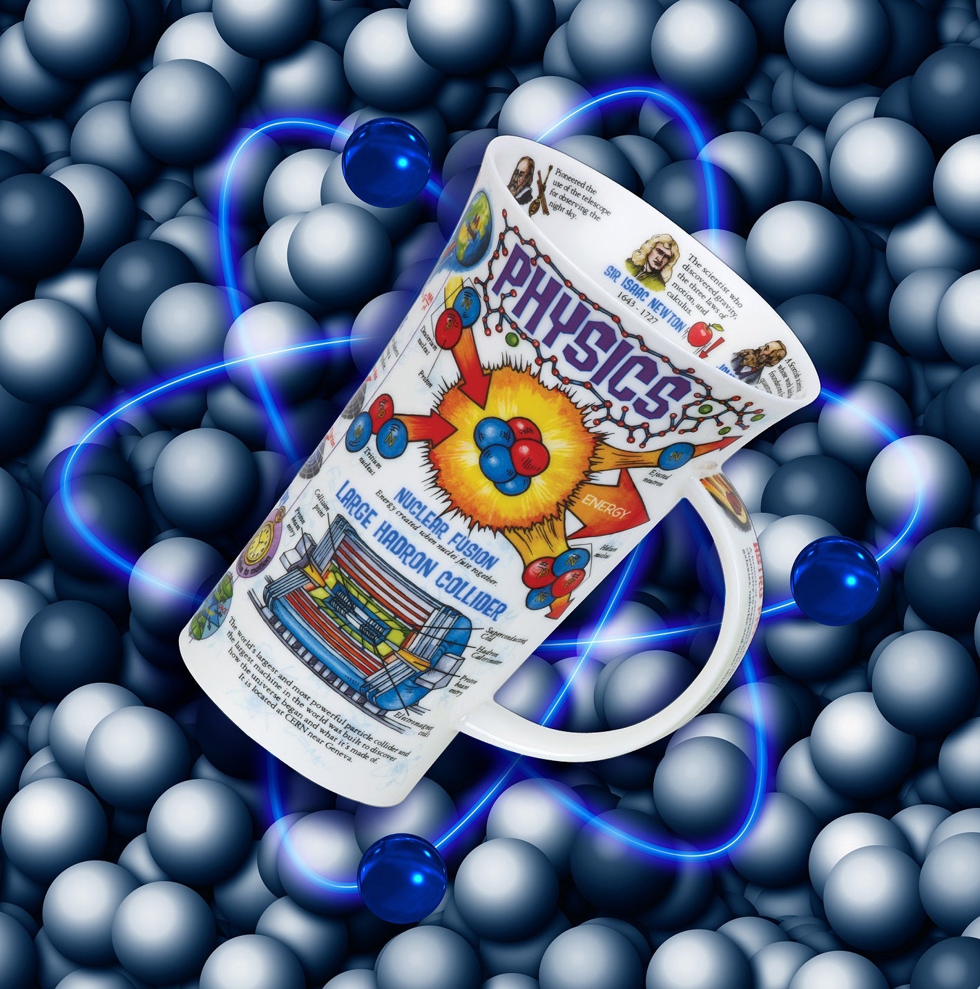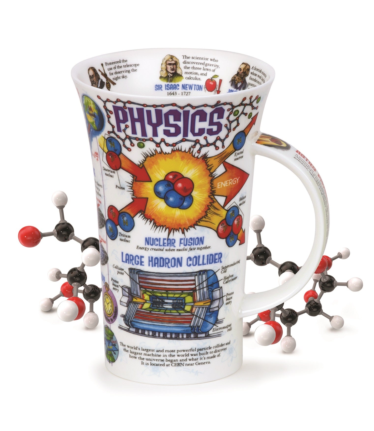Dunoon Glencoe Physics\nDer \"Dunoon Glencoe Physics\" Kaffee-Becher und Tee-Tasse ist ein unvergleichliches Produkt für Liebhaber der Wissenschaft. Hergestellt von der renommierten Marke Dunoon, besticht dieser Becher durch sein faszinierendes Design, das physikalische Themen wie Atommodelle, den Large Hadron Collider und berühmte Physiker wie Sir Isaac Newton illustriert.\nMit einem weißen Hintergrund und farbenfrohen Grafiken und Texten in Blau-, Orange-, Rot- und Gelbtönen ist dieser Becher nicht nur ästhetisch ansprechend, sondern auch informativ und lehrreich. Die detailreichen Illustrationen und Texte bieten einen nützlichen Einblick in die Welt der Physik und machen jede Tasse Tee oder Kaffee zu einer kleinen Lektion in Wissenschaft.\n\n Einzigartiges Design: Der Becher zeigt detaillierte und bunte Grafiken von physikalischen Konzepten und berühmten Physikern.\n Bildungsfördernd: Nutzen Sie Ihre Pausen, um mehr über Physik zu lernen und Ihr Wissen zu erweitern.\n Qualität von Dunoon: Hergestellt aus hochwertigem Material, das Langlebigkeit und Robustheit garantiert.\n\nDer \"Dunoon Glencoe Physics\" Becher ist nicht nur als Trinkgefäß geeignet, sondern auch als dekoratives und informatives Objekt, das Ihre Küche oder Ihr Büro bereichern wird. Entdecken Sie die faszinierende Welt der Physik bei jeder Tasse.