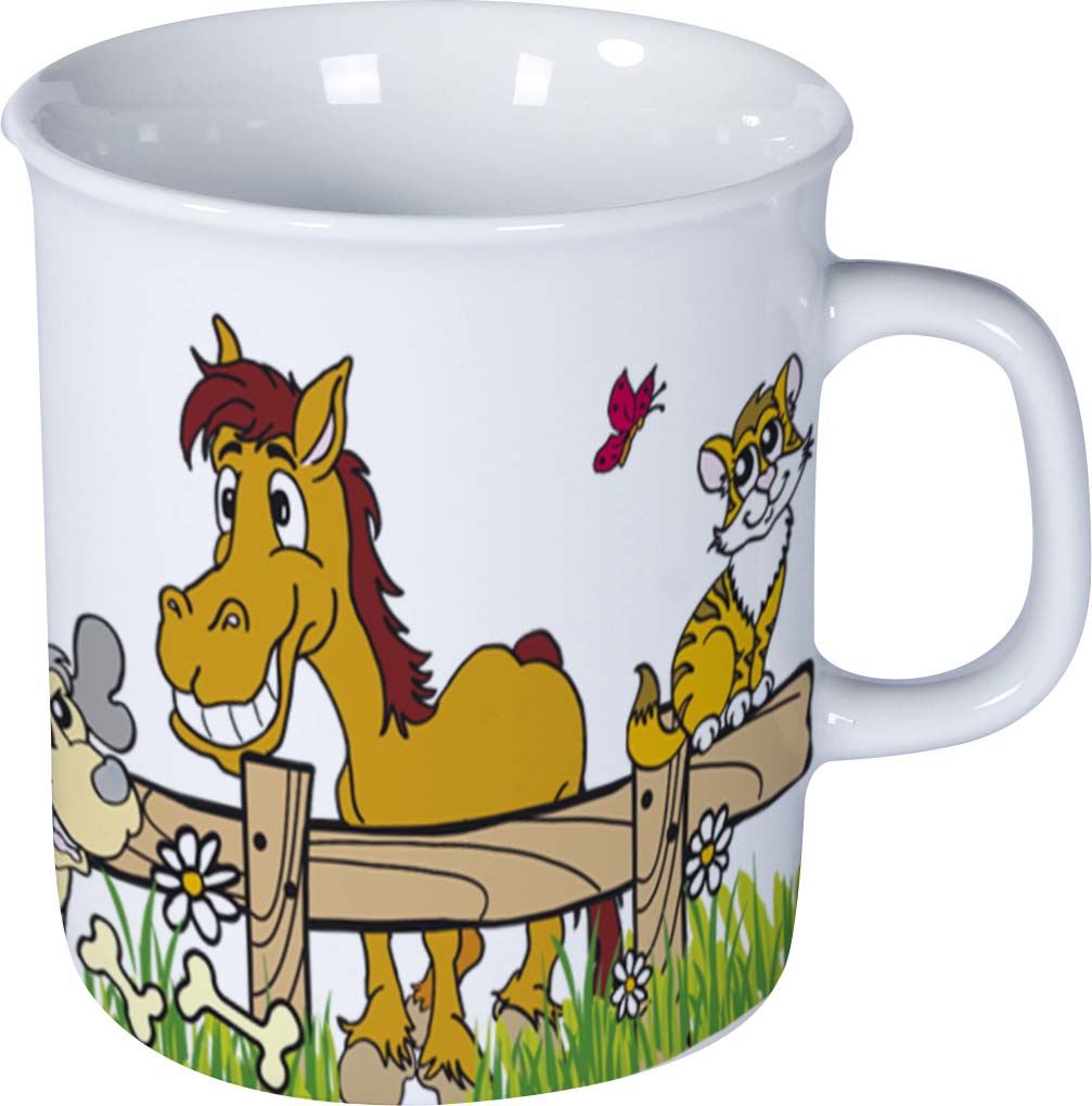 Kindergedeck 3-tlg. Porzellan funny Pferd Erfreuen Sie Ihre kleinen Feinschmecker mit diesem zauberhaften Kindergedeck von L.E.R.D.93. Das 3-teilige Set aus hochwertigem Porzellan besteht aus einer Tasse, einem tiefen Teller und einem flachen Teller. Alle Teile sind mit bunten, cartoonhaften Illustrationen von einem lustigen Pferd, einem niedlichen Hund und hübschen Blumen verziert, die das Essen für Kinder zu einem freudigen Erlebnis machen. Premium Porzellan Das Geschirrset ist aus erstklassigem Porzellan der Thüringer Traditionsmanufaktur gefertigt. Kinderfreundliche Motive Die freundlichen und farbenfrohen Illustrationen sind speziell für Kinder gestaltet. Robust und Langlebig Das Set ist perfekt für den täglichen Gebrauch geeignet und spülmaschinenfest. Das Kindergedeck umfasst eine Tasse mit einem angenehmen Griff, der gut in kleinen Händen liegt, einen tiefen Teller, der sich hervorragend für Suppen, Müsli und andere Speisen eignet, sowie einen flachen Teller, der ideal für Snacks und Hauptgerichte ist. Dieses hochwertige Porzellangeschirr ist nicht nur praktisch, sondern auch eine wunderbare Geschenkidee für Kinder. Setzen Sie auf die Qualität "Made in Germany" und machen Sie den Alltag Ihrer Kinder mit diesem charmanten Kindergeschirr zu etwas Besonderem.