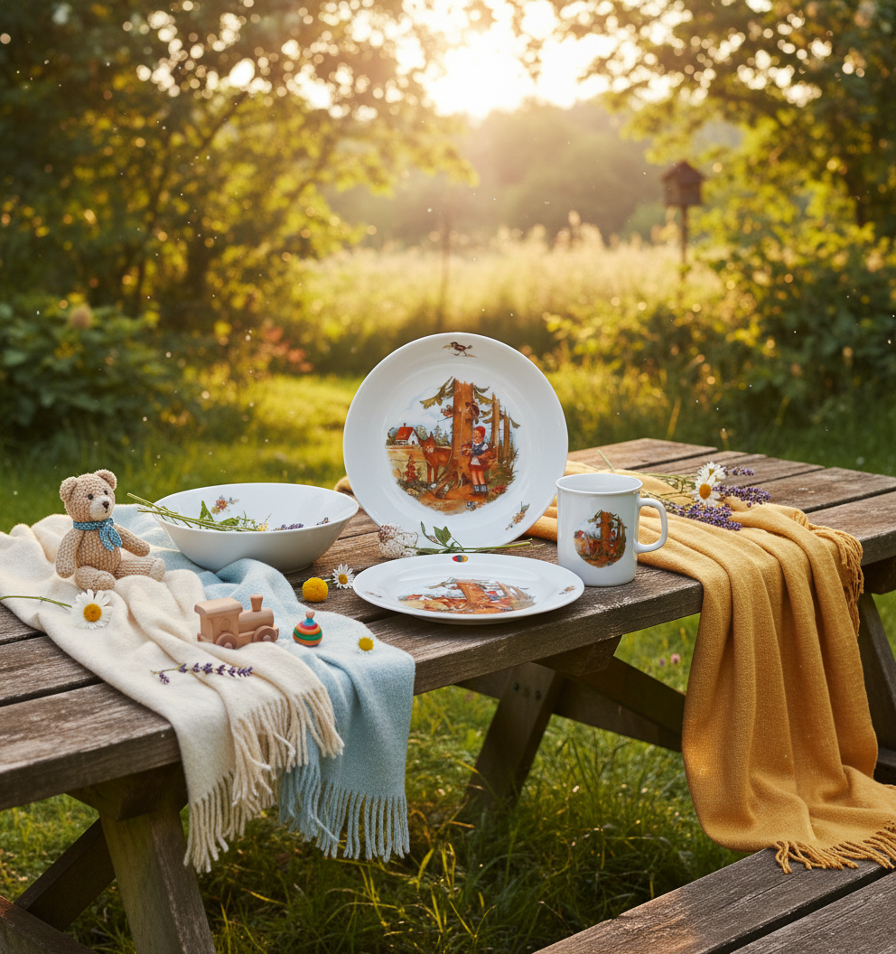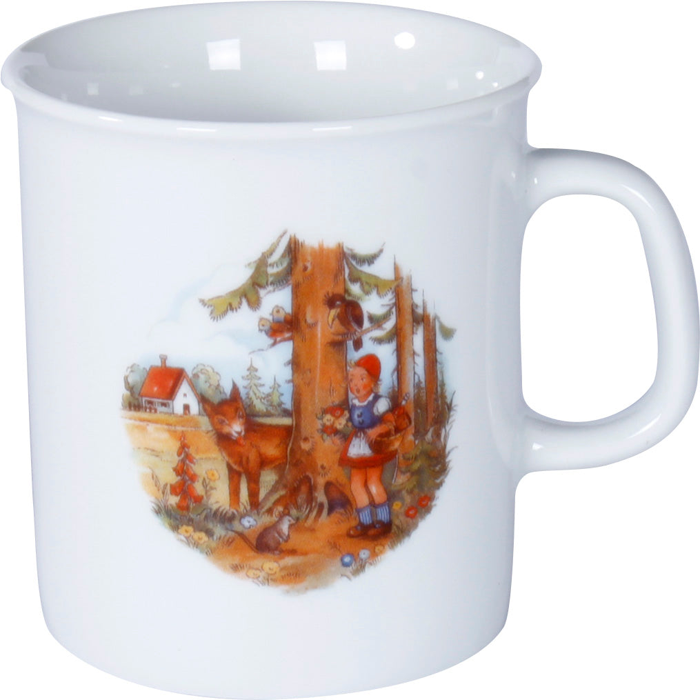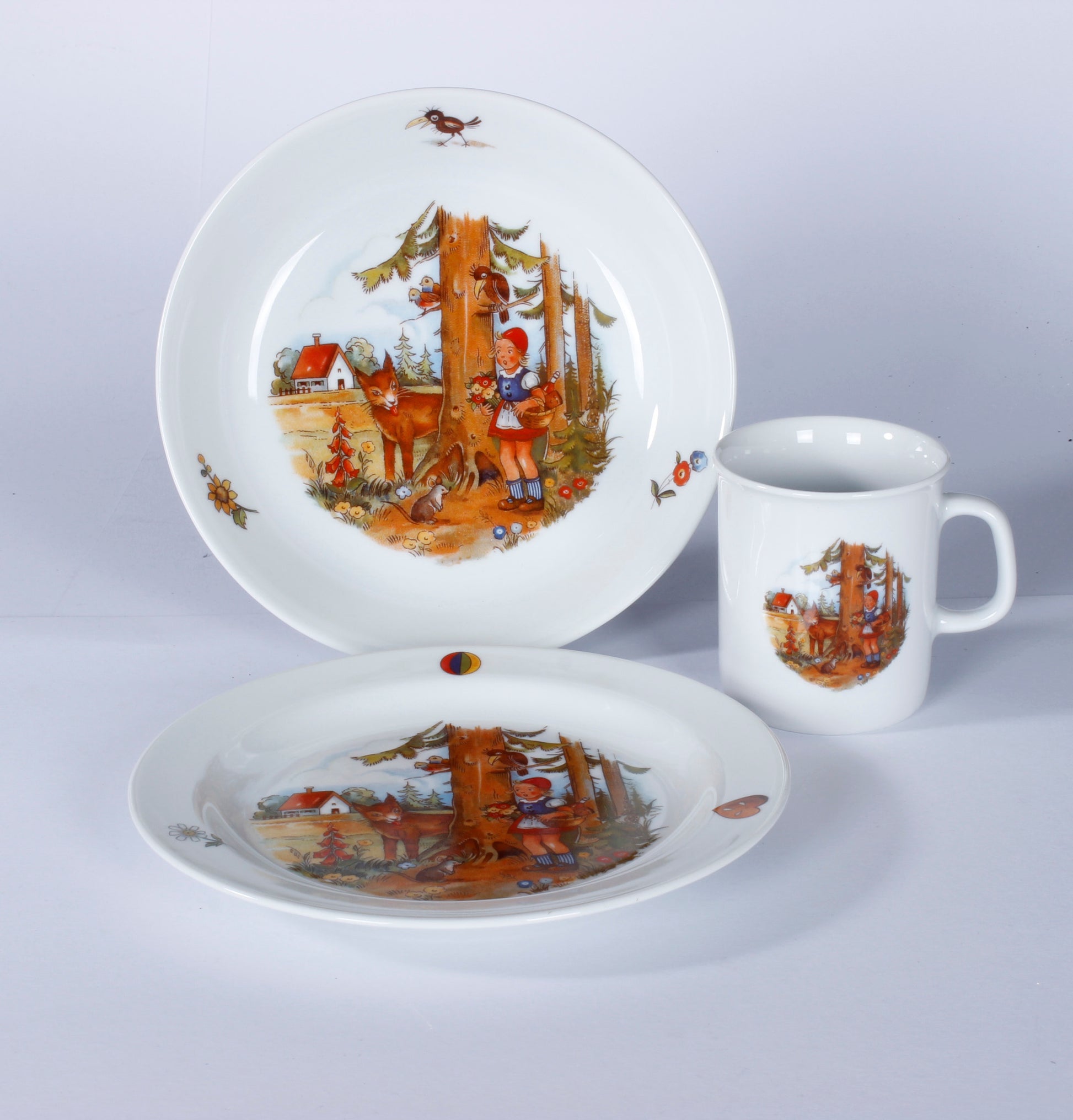 Kindergedeck 3-tlg. Porzellan Wunderschönes buntes Märchenmotiv \"Rotkäppchen\"\nTauchen Sie ein in die zauberhafte Welt der Märchen mit dem hochwertigen Kindergedeck der Marke L.E.R.D.93. Dieses dreiteilige Porzellangeschirr ist ideal für Kinder und bringt bei jeder Mahlzeit Freude und eine märchenhafte Atmosphäre. Das Set beinhaltet einen tiefen Teller, einen flachen Teller und eine Tasse, alle verziert mit bunten Illustrationen der Rotkäppchen-Geschichte nach Gebrüder Grimm.\n Hochwertiges Kindergedeck Gefertigt in einer Thüringer Manufaktur aus langlebigem und spülmaschinengeeignetem Porzellan. Charakteristisches Märchenmotiv Das Set ist liebevoll mit der Geschichte von Rotkäppchen in sanften Braun-, Grün-, Rot- und Blautönen gestaltet. Perfekte Größen Tiefer Teller: Durchmesser 20 cm, flacher Teller: Durchmesser 21 cm, Tasse: Durchmesser 7,5 cm, Höhe 8 cm, Fassungsvermögen 180 ml.\nDie Geschichte von Rotkäppchen erzählt von einem kleinen Mädchen, das durch den Wald geht, um seiner kranken Großmutter Essen zu bringen, und dabei einem bösen Wolf begegnet. Dieses bezaubernde Kindergedeck ist ein ideales Geschenk für Geburt, Taufe oder Weihnachten und bringt die Magie dieses klassischen Märchens in Ihren Alltag. Made in Germany.