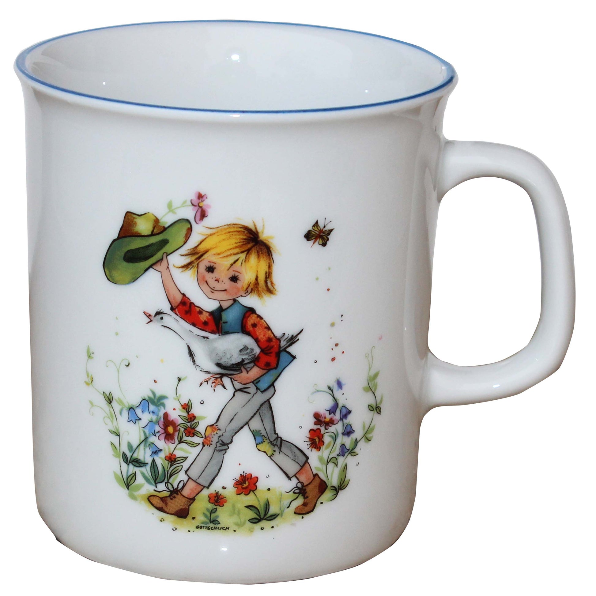 Kindergeschirr Set Porzellan 3-teilig von L.E.R.D.93 Das "Kindergeschirr Set Porzellan 3-teilig" von L.E.R.D.93 ist die perfekte Geschenkidee für junge Genießer. Dieses Set beinhaltet einen flachen Teller, einen tiefen Teller und eine kleine Tasse, allesamt verziert mit bunten Illustrationen eines Kindes, das einen Hut hält, sowie Blumen und einem Vogel. Die Teller sind zudem mit einem eleganten blauen Rand versehen. Langlebig und Spülmaschinengeeignet Das Kindergeschirr-Set besteht aus hochwertigem Porzellan aus einer Thüringer Manufaktur, das besonders langlebig und spülmaschinengeeignet ist. Mikrowellengeeignet Die Teile dieses Sets sind mikrowellengeeignet, was das Aufwärmen von Speisen besonders einfach macht. Kindgerechtes Design Mit fröhlichen und kindgerechten Illustrationen ist dieses Set nicht nur funktional, sondern auch optisch ansprechend. Die Geschichte von "Hans im Glück" zieht sich als Märchenmotiv durch die Gestaltung. "Hans im Glück" ist ein klassisches deutsches Märchen, in dem Hans verschiedene Tauschgeschäfte macht, bis er am Ende glücklich und zufrieden mit nichts als sich selbst nach Hause zurückkehrt. Dieses motivierende Märchen ist liebevoll auf das Geschirr Set übertragen, was es zu einem wahren Hingucker macht. Flacher Teller: Durchmesser 21 cm Tiefer Teller: Durchmesser 20 cm Tasse: Durchmesser 7,5 cm, Höhe 8 cm, Fassungsvermögen 180 ml Dieses Set ist ideal für den täglichen Gebrauch sowie besondere Anlässe und eignet sich hervorragend als Geschenk zu Weihnachten, Taufe oder Geburtstag. Verleihen Sie Ihrem Tisch ein modernes, kindgerechtes Flair mit dem "Kindergeschirr Set Porzellan 3-teilig" von L.E.R.D.93.